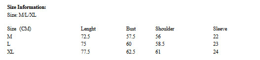 XL: Length 77.5 | Bust 62.5 | Shoulder 61 | Sleeve 24