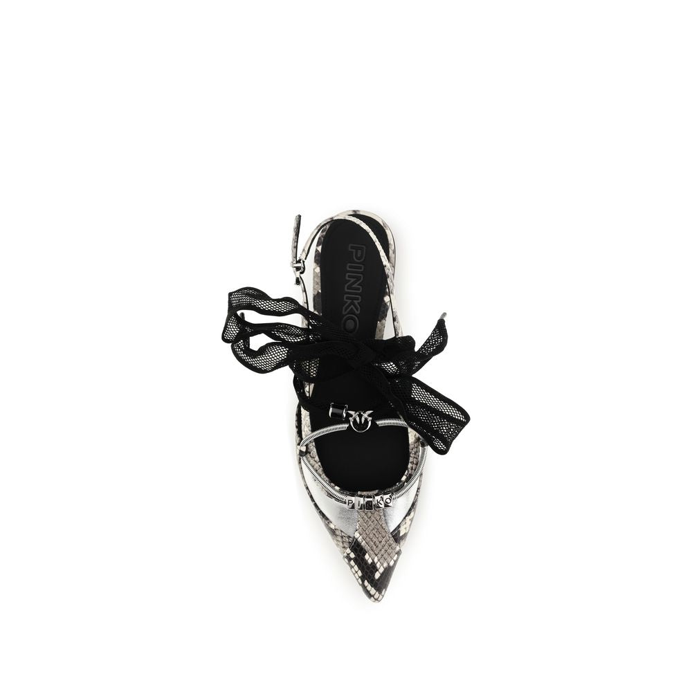 The python-print Gianira Ballerinas by Pinko combine bold style with handcrafted sophistication. The pointed toe model, with a leather upper, is completed with an adjustable buckle closure and an elasticized insert for a comfortable fit. Metal appliqués, beading and silver details, along with the logo and python pattern, enrich the shoe with a distinctive and modern touch, while the rubber sole ensures comfort and stability.