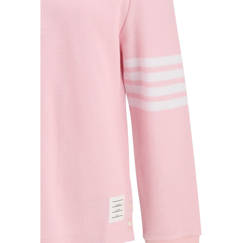The Textured Piqué 4-Bar long-sleeve Polo by Thom Browne is crafted from textured cotton piqué, offering a structured hand feel and an elevated surface. The design is defined by the iconic 4-bar detailing on the sleeve, adding a distinctive graphic contrast. A partial front button closure, along with ribbed collar and cuffs, highlights the brand’s refined and disciplined aesthetic. Buttoned side vents with RWB grosgrain trim, a stepped hem, the name tag appliqué, and the signature striped grosgrain loop tab at the back complete this piece, reflecting Thom Browne’s tailored approach to everyday essentials.