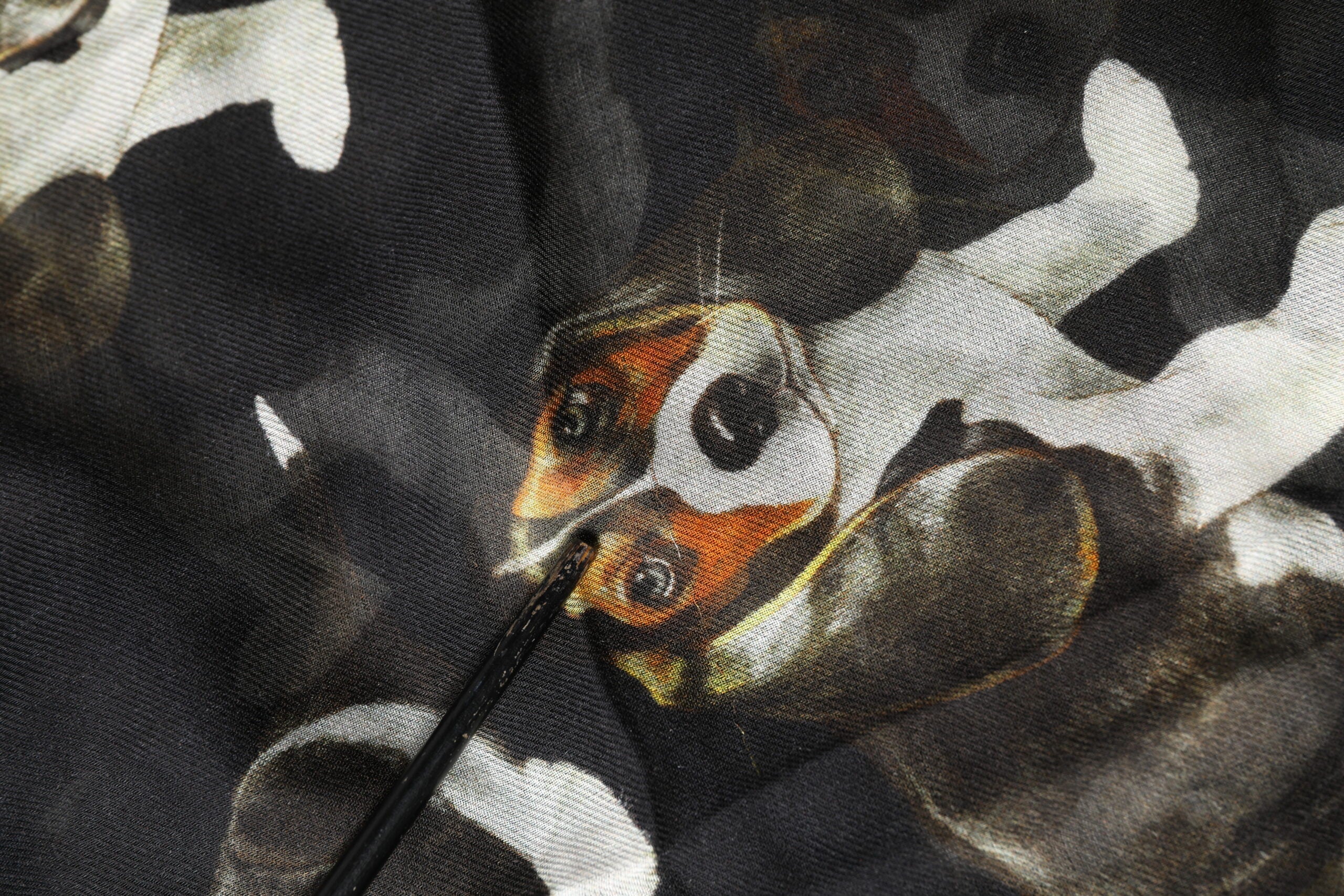 scarf. This distinctive luxury accessory features a playful dog print design set on a classic black background, highlighting Dolce & Gabbana’s iconic blend of creativity and Italian elegance. Crafted from a soft modal and wool blend, the scarf offers a lightweight yet warm feel, finished with fringed edges and subtle logo detailing.