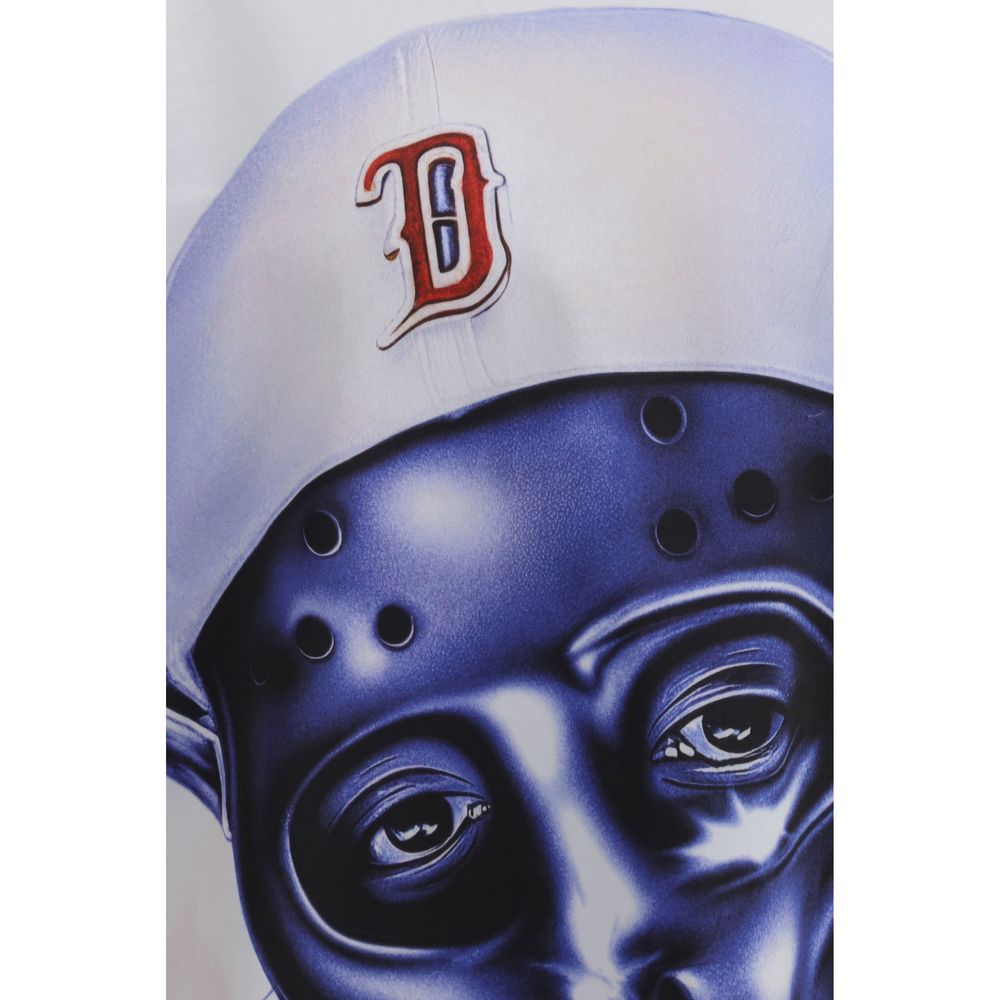 The long-sleeve T-Shirt with print by PDF Channel combines uniqueness and refined aesthetics in a contemporary design. The oversized crewneck silhouette ensures freedom of movement, while a bold front print featuring a stylized metallic blue mask with a graphic “D” adds artistic depth and strong visual impact. Crafted from high-quality cotton, it provides exceptional softness and durability. Contrasting finishes, with a subtle orange layer emerging beneath the white fabric, introduce an avant-garde and sophisticated touch.