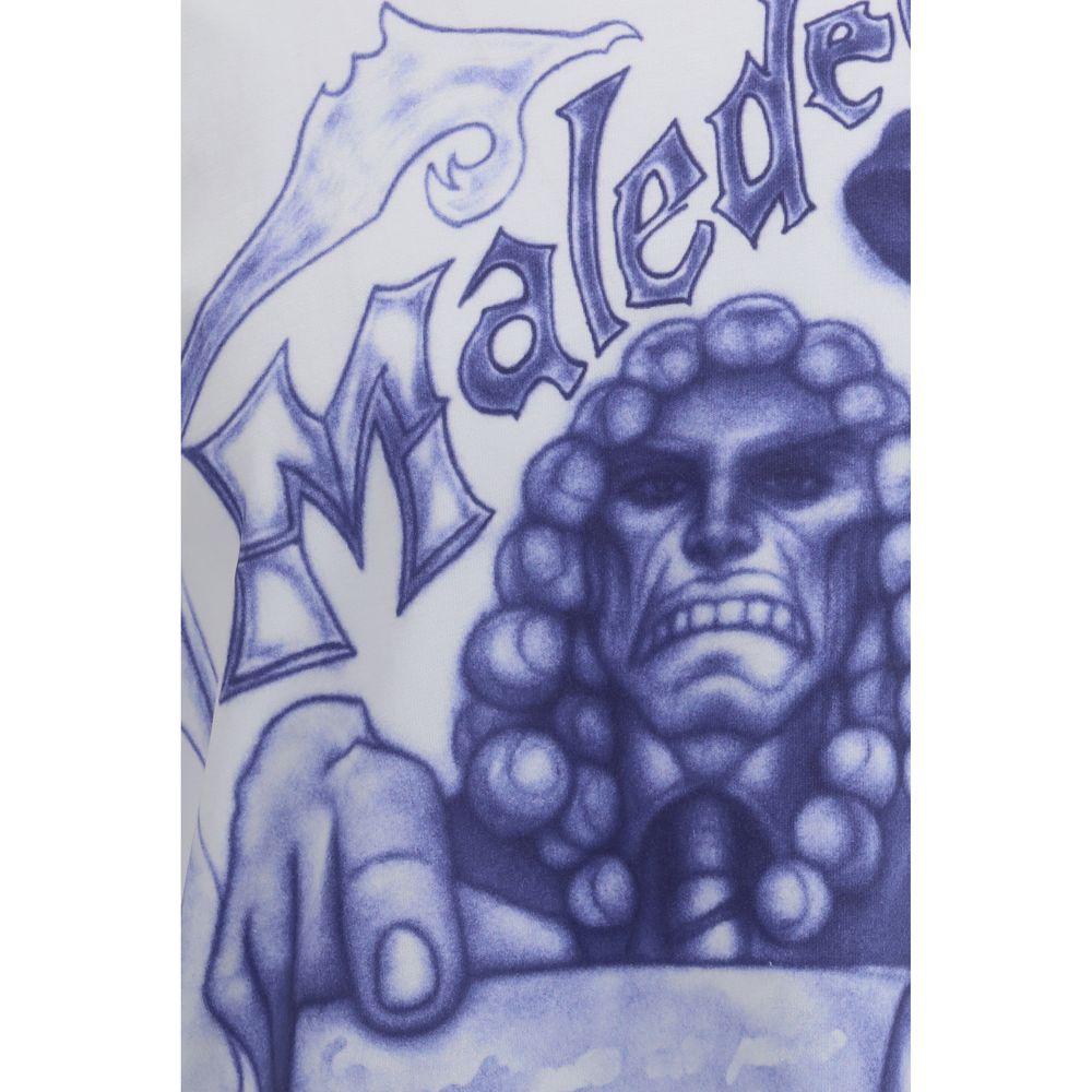 The cotton T-Shirt with print by PDF Channel is designed for those who appreciate unconventional elegance with a contemporary edge. Crafted from high-quality, slightly structured cotton, it combines softness with durability. The white base contrasts sharply with the expressive blue-toned print depicting a figure holding a judge’s gavel and an unfurled scroll, enhanced by the gothic “Maledetto” lettering. The oversized silhouette with short sleeves and a classic crew neckline ensures freedom of movement, making it suitable for everyday wear as well as more elevated styling.